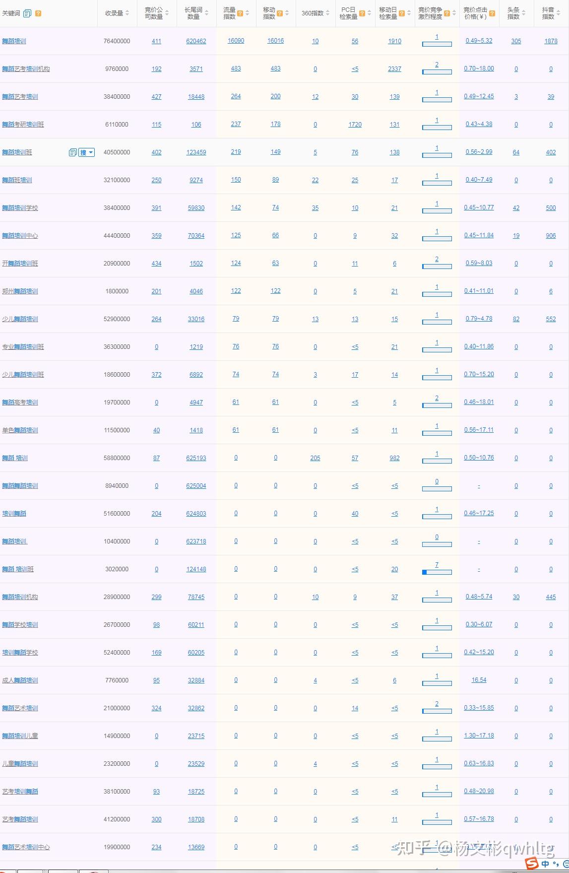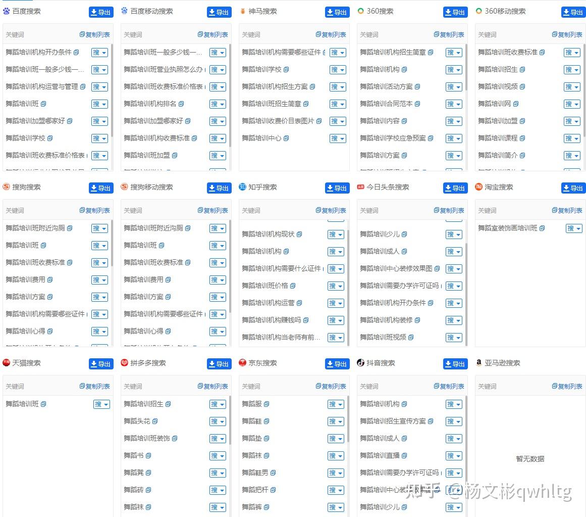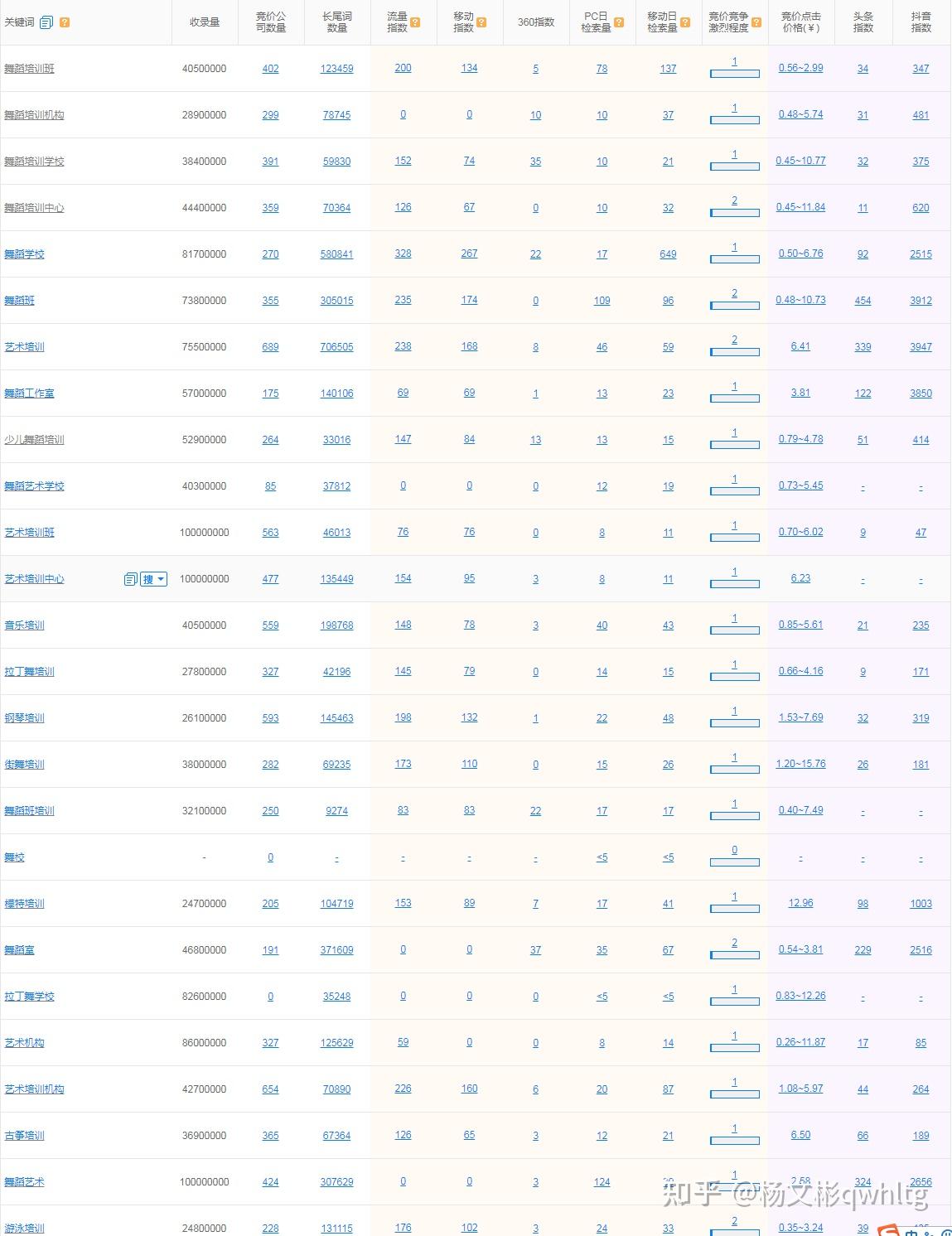 从图中可看到,像舞蹈培训班,舞蹈培训机构,舞蹈培训学校,舞蹈培训中心,舞蹈学校,舞蹈班,艺术培训等等关键词都是客户平常搜索比较多的词或句。