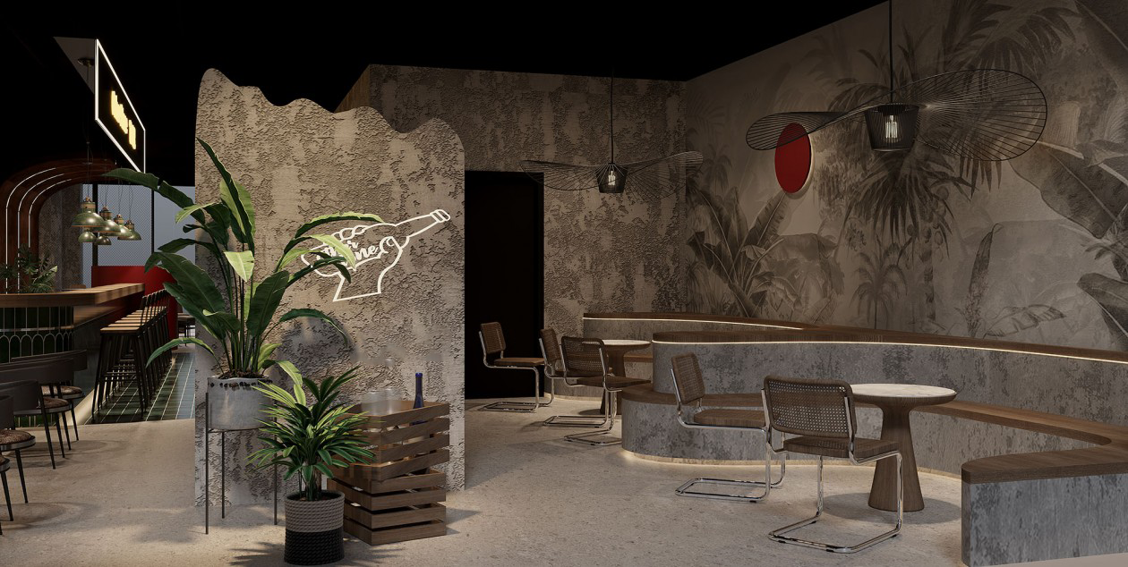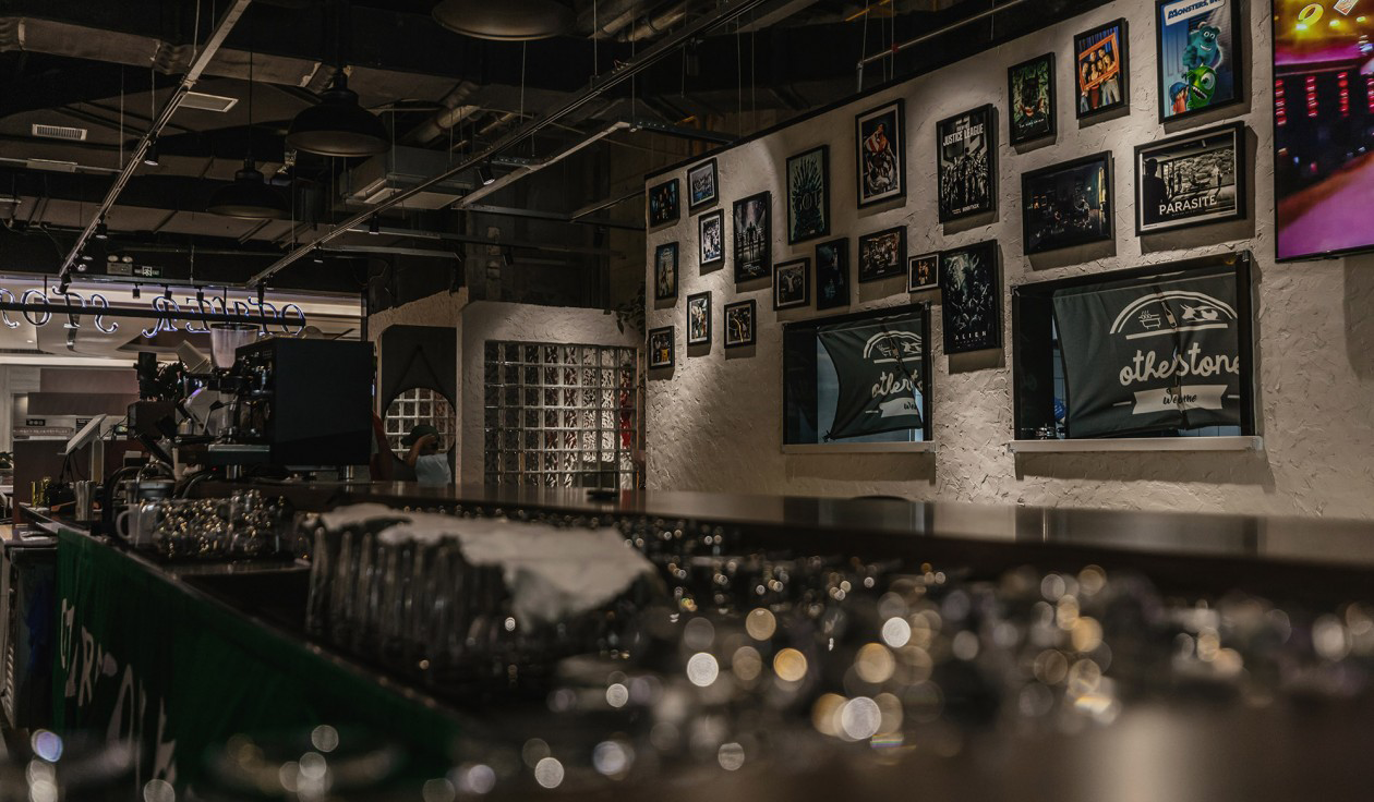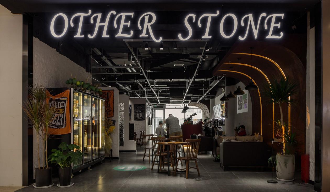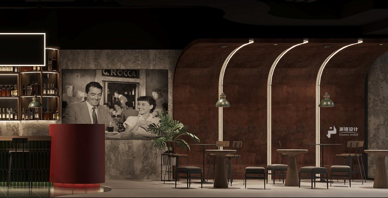 小酒馆有点像是粗犷的工业风,顶部是简单的黑色钢筋,安装着筒灯和射灯。整体上将空间的高度拉伸。