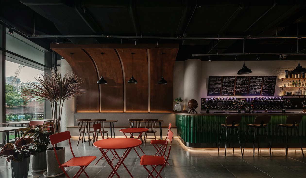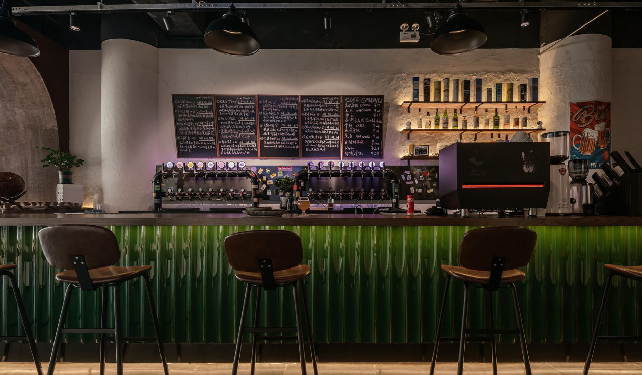 粗犷的弧形卡座背景顶与做旧处理的铁艺艺术漆面,两者碰撞营造出美式复古工业感。墨绿色和复古红,温润的木质与冷硬的金属,这些元素大胆而强烈地碰撞在一起,散发出一股随意的复古摩登feel。这种整体的空间节奏和调性,也蕴含着他山精酿的老板当初决心要做啤酒时,果断且勇敢的精神。
