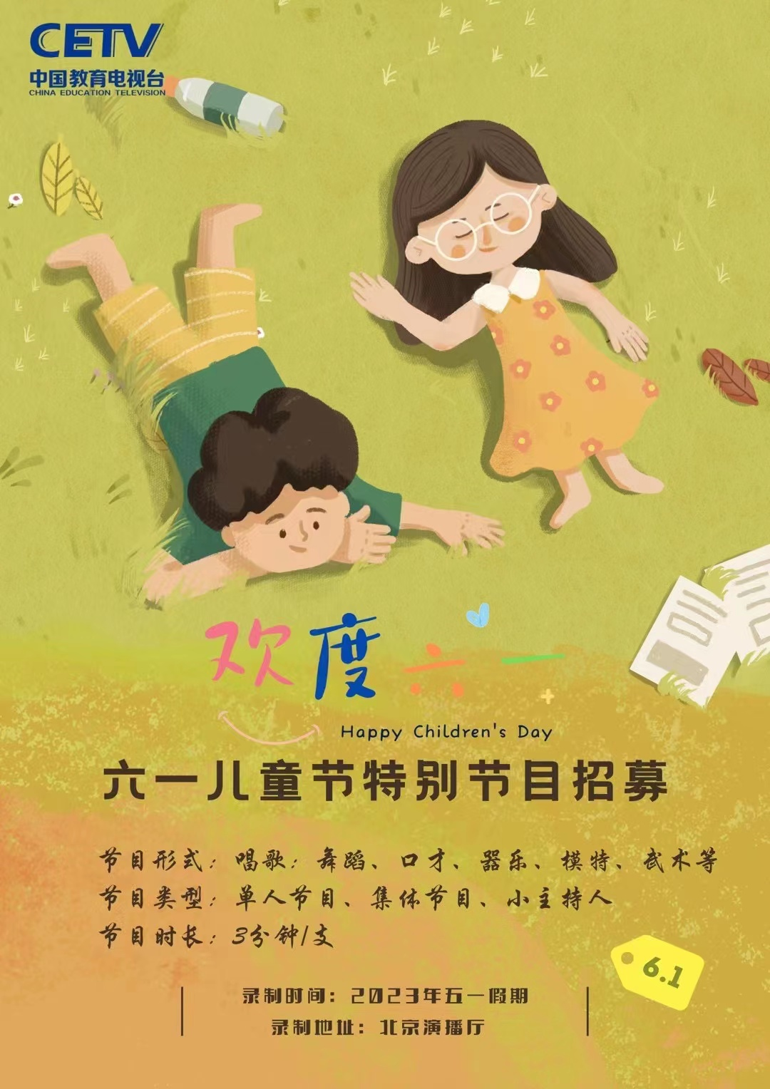 中国教育电视台六一晚会招募小主持人5-16岁招募优秀节目:唱歌、舞蹈、朗诵,古筝,架子鼓,武术等地点:北京