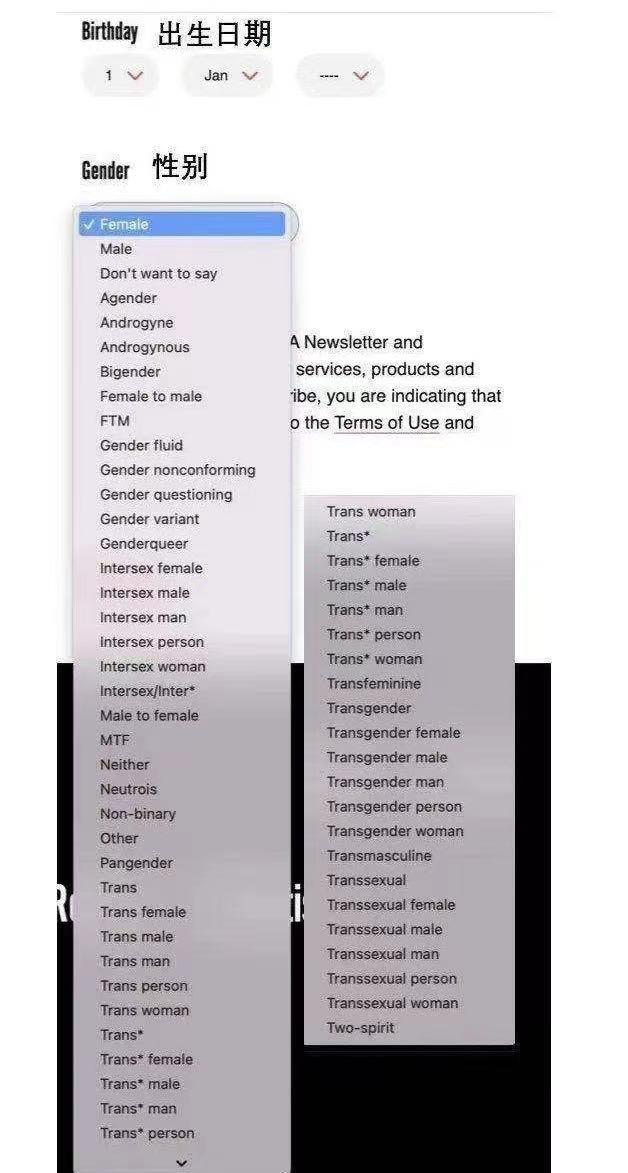 比如,你在欧美的社交网站,填写个人的资料的时候,在选择性别这一栏,对方就会很贴心,很照顾的给你下拉出几十种性别。
