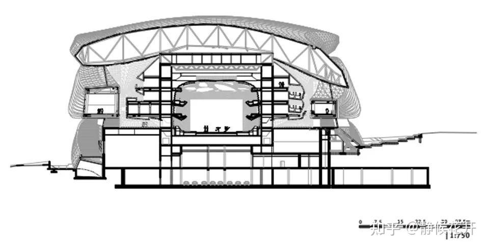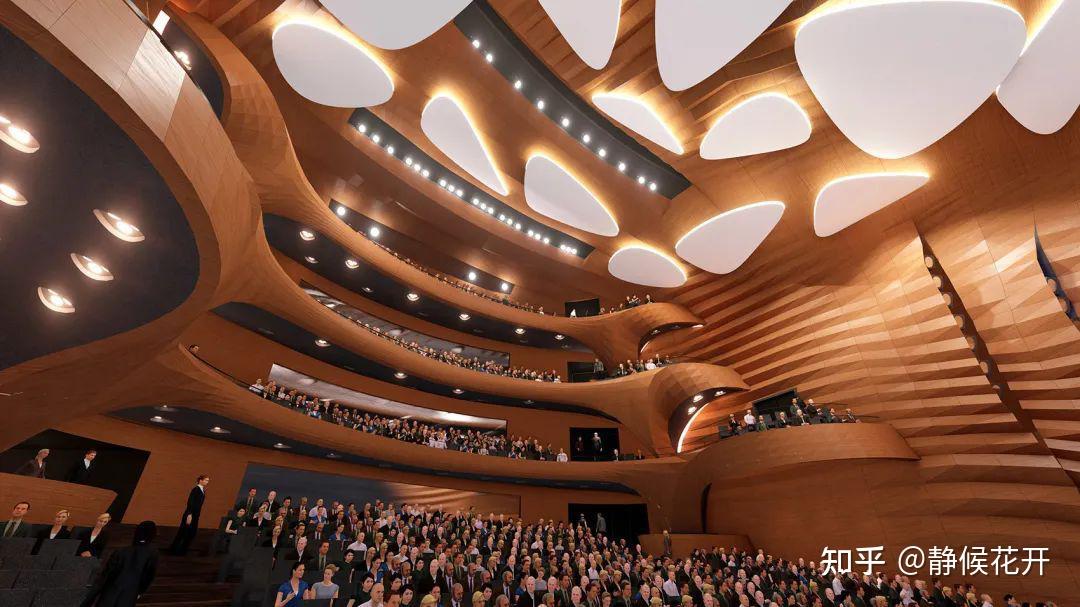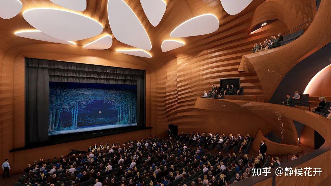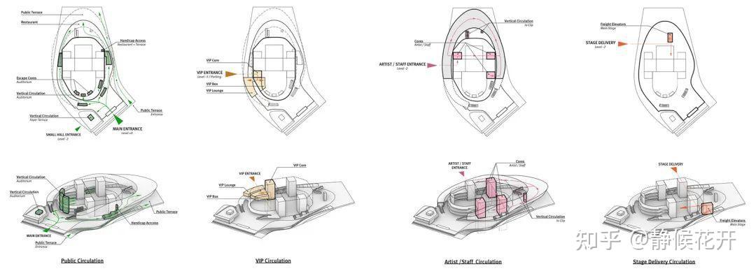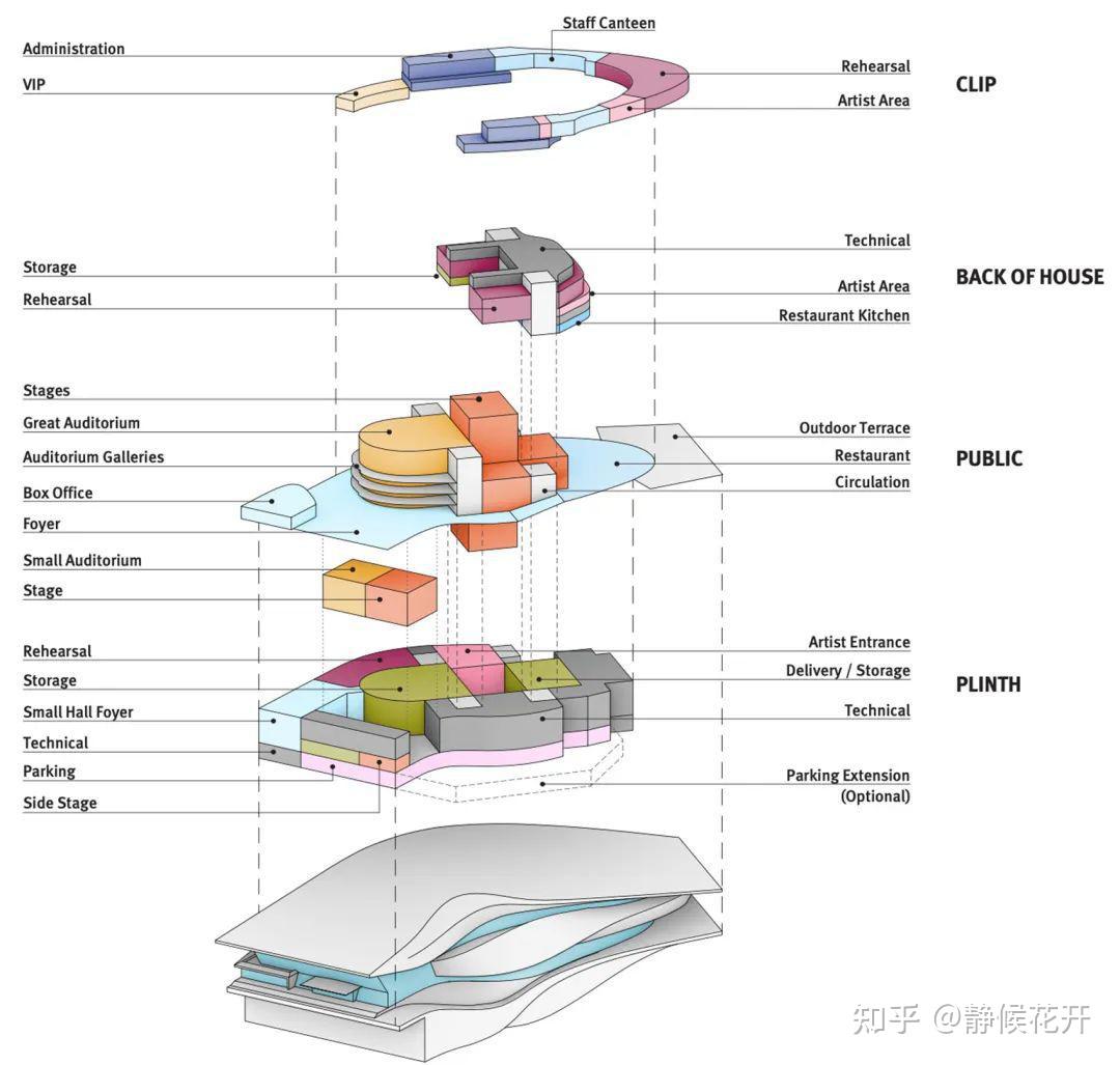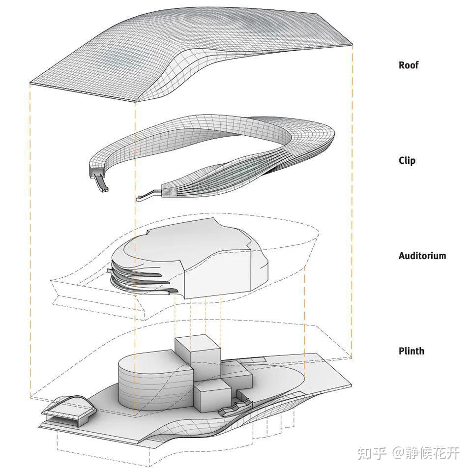 环形的“卡子”以蜿蜒姿态运动环绕着主音乐厅,将屋顶与低层基座相连。它涵盖了几乎所有与外部接壤的后台功能,包括芭蕾舞排练室、食堂、贵宾更衣室、贵宾区和办公室。