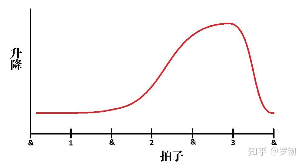 第1拍的后半拍开始上升,第2 和 3拍 继续上升,第3拍结束时降低。