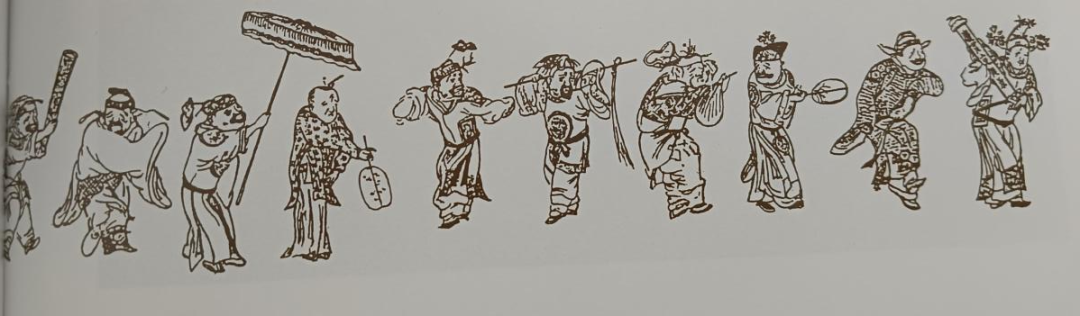 图中的舞队是以牌楼屏风为界,由班首、舞蹈表演者和乐队儿各部分组成。